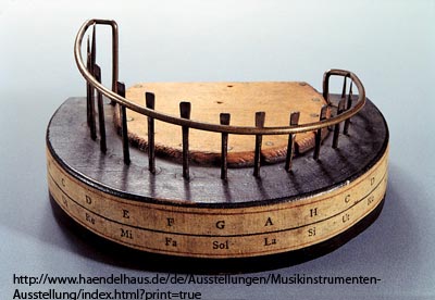here an image from the Händelhaus in Halle - you have to scroll down a bit on the page) basically is a wooden box with nails driven into the rim, and the nails raise a sound when bowed; it came around in the 18th century, but really did not make the charts. Like the Glass-Harp (Site needs Real Player), I heard one once "live" in my life yet, and it was really amazing, ever again, Miss Sophie. You can also see a glass-harp in the exhibition of the Händelhaus in Halle.
