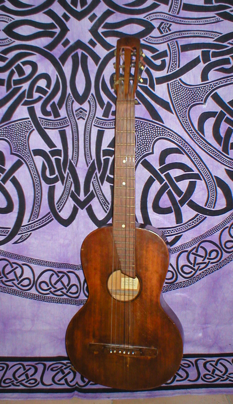 Passing through a village one day a guitar neck looked out of a rubbish heap and made me stop. Upon closer inspection a really mistreated older guitar came into my possession, or better the partly possession, because it was all bits and pieces, screws were driven though the tailspiece and other atrocities incured. Cleaning, removing shellac, assembly in the good old way (tying the parts together with rope and slowly binding glue), putting on new coat of shellac. All parts are still original, except of new strings. The sound is a bit weak in treble, but nice for Beatles stuff. The model name "Amourette" is embossed in the top. No further details of origin found. Now she is played by my younger daughter J. For a larger image please click on the small on here.