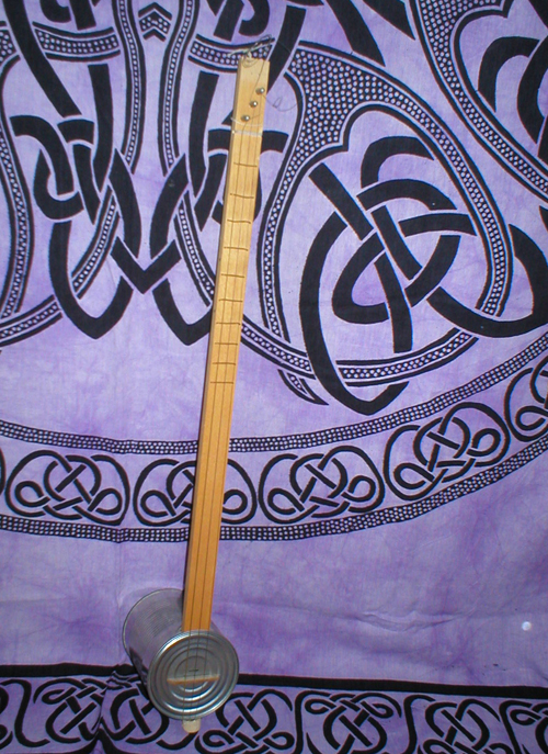 One Sunday afternoon, while the family was away, I stumbled through the cellar and came up with these items: a sauerkraut-tin, a piece of beech-wood from a lath floor, some zither tuning pegs and used guitar strings. Plus some copper wire and some tools. So this instrument was generated and is quite nice to play simple and bourdun-tunes on it. The sound is a bit metallic, close to a banjo. And as the neck is rather flexible it may produce some wha-wha-effect as well.